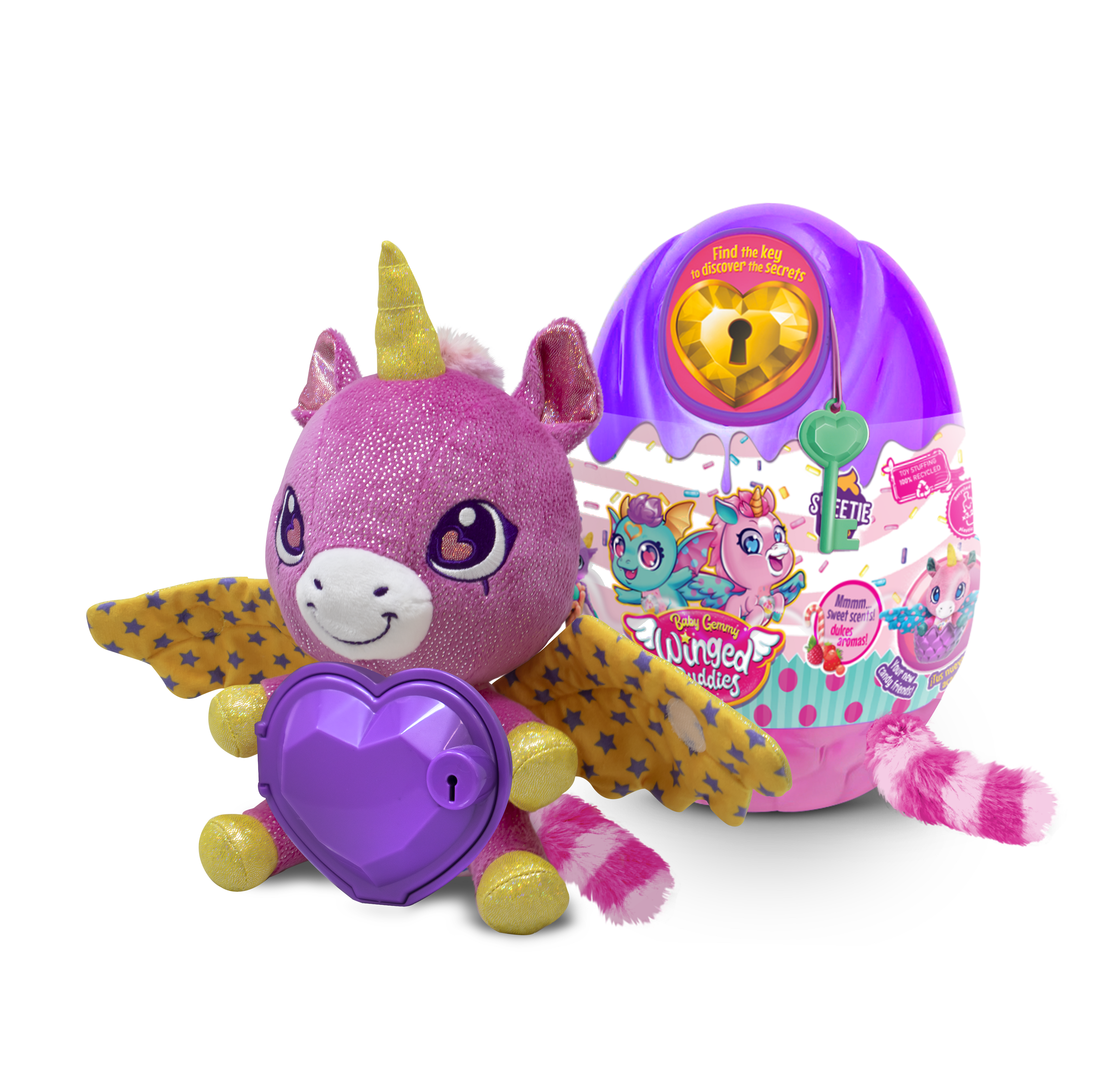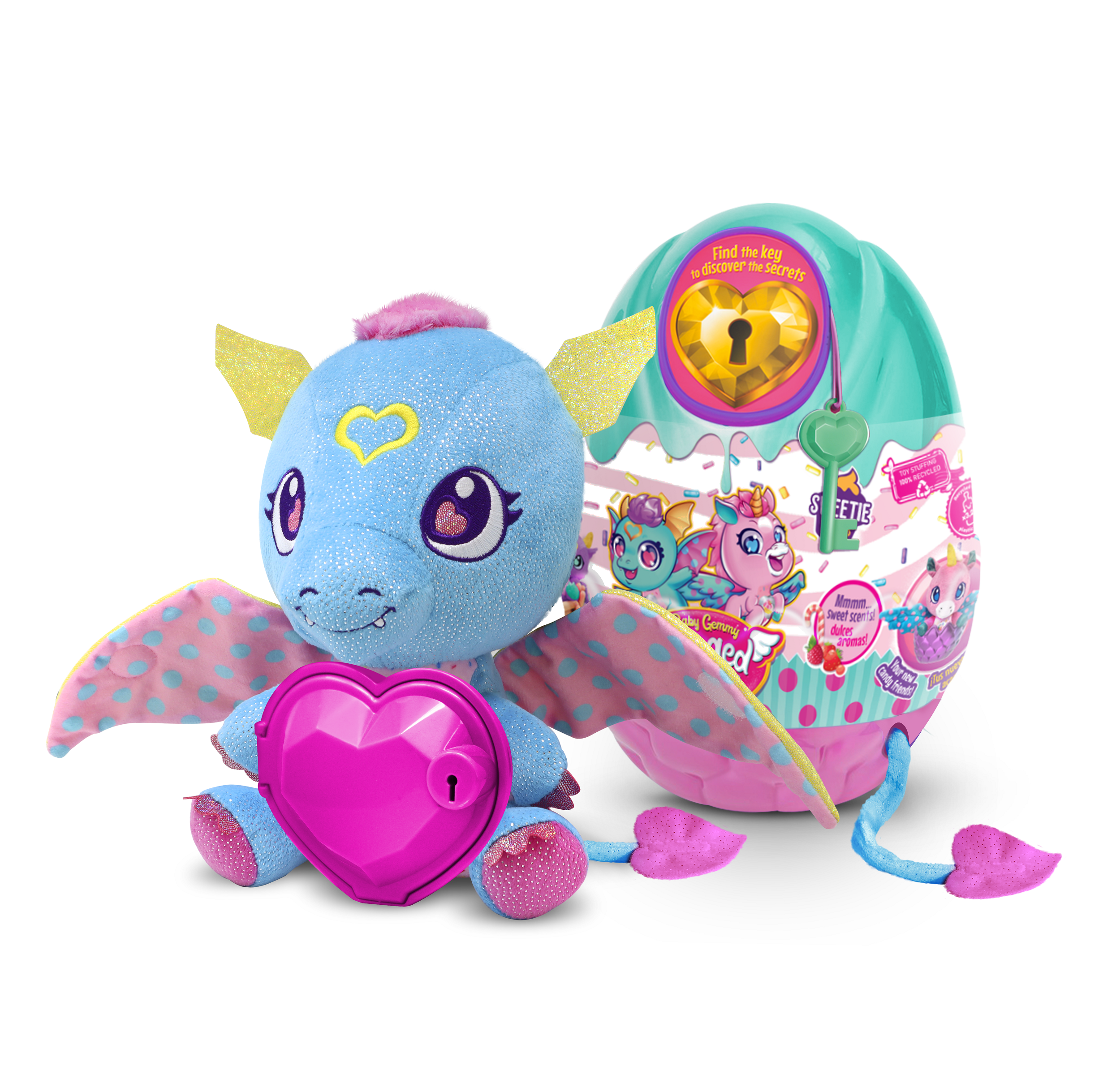 Your Baby Gemmy Sweety Secrets hides precious surprises for you. There are 6 scented characters to collect. Open the heart and discover them. Keep your secrets in its heart and lock them, it will protect them. Big Surprise Eggs The Gem will become a secret heart box. The girls will open it with the key that is hanging outside the egg.