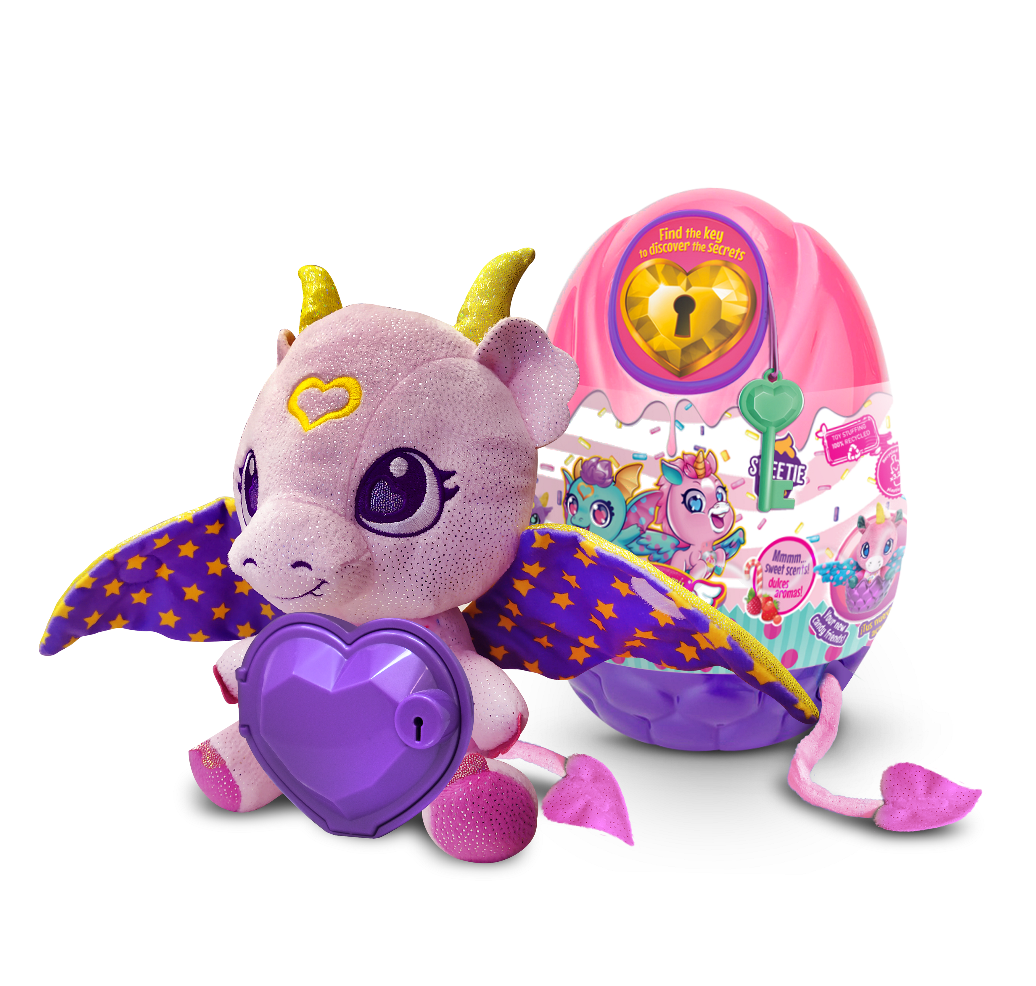 Inside the heart the girls will find: 3 surprise envelops with following accessories related to the Dragon or Unicorn world 1 ring, 1 bracelet and stickers. The tail ALWAYS outside of the packaging. 6 characters to collect (3 Unicorns and 3 Dragons). 3 different scent: plum, apple & strawberry. Secret Heart box is detachable from the character. 100% recycled stuffing. Cupcake card & stickers sheet to decorate.
