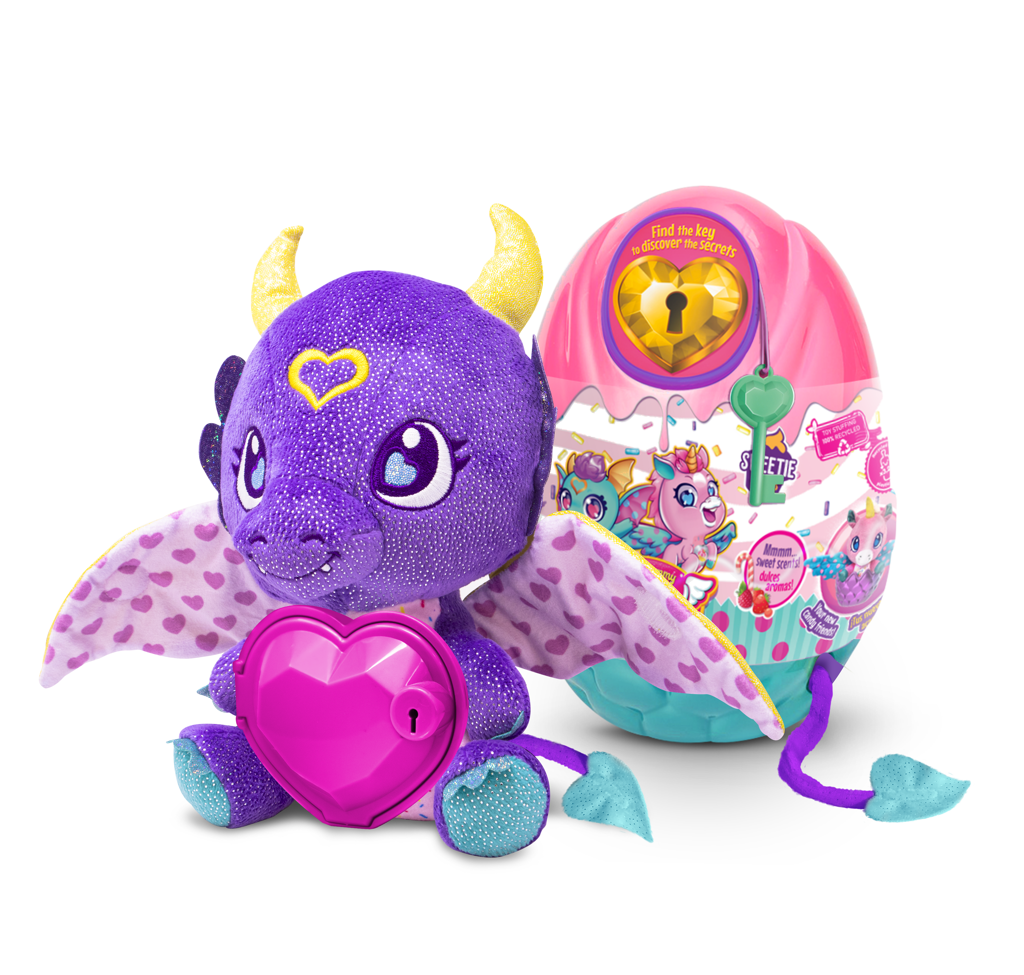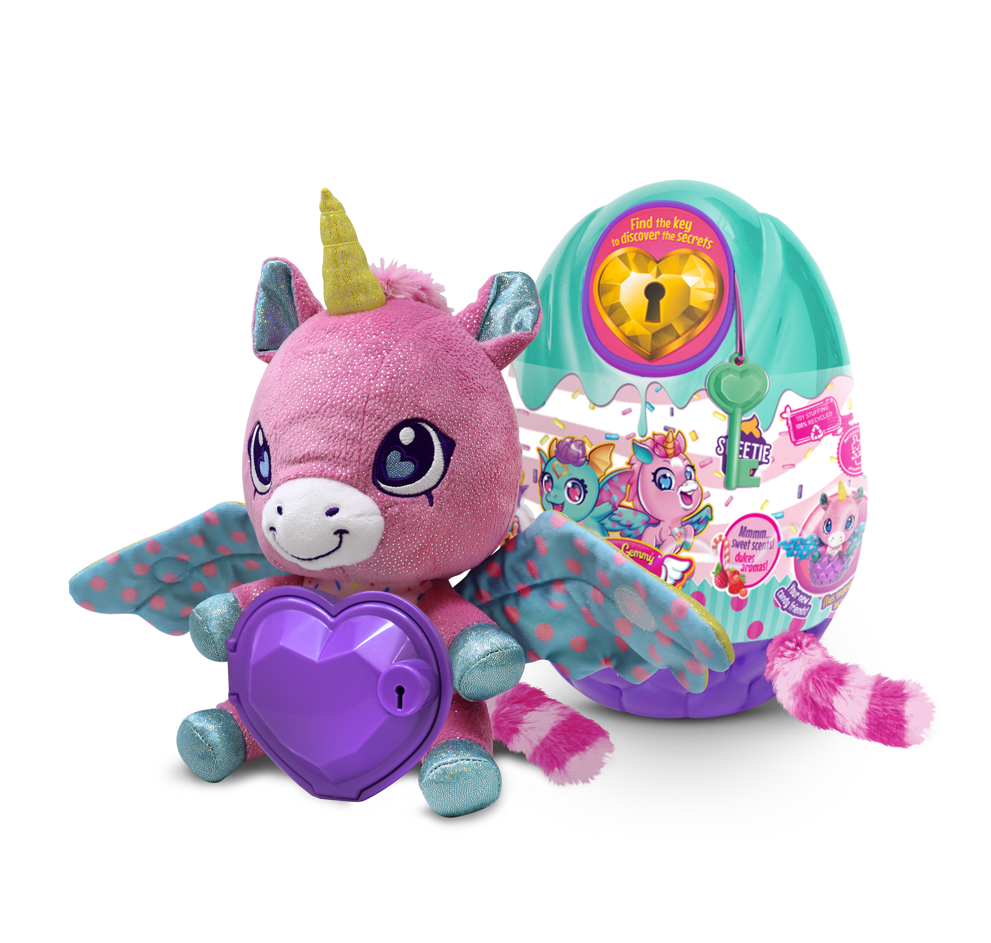 Inside the heart the girls will find: 3 surprise envelops with following accessories related to the Dragon or Unicorn world 1 ring, 1 bracelet and stickers. The tail ALWAYS outside of the packaging. 6 characters to collect (3 Unicorns and 3 Dragons). 3 different scent: plum, apple & strawberry. Secret Heart box is detachable from the character. 100% recycled stuffing. Cupcake card & stickers sheet to decorate.