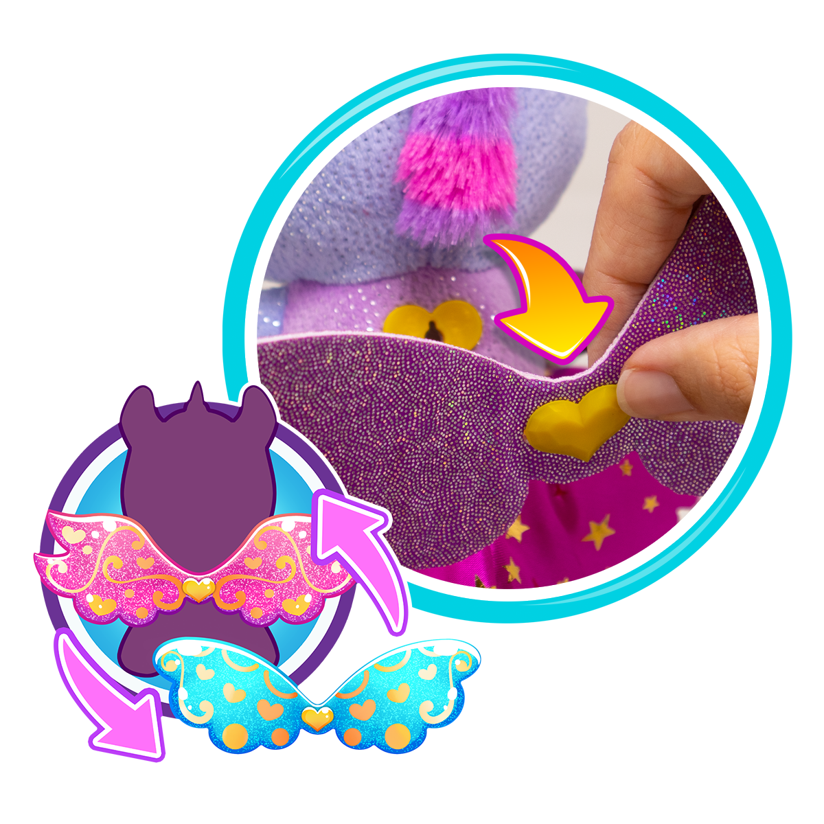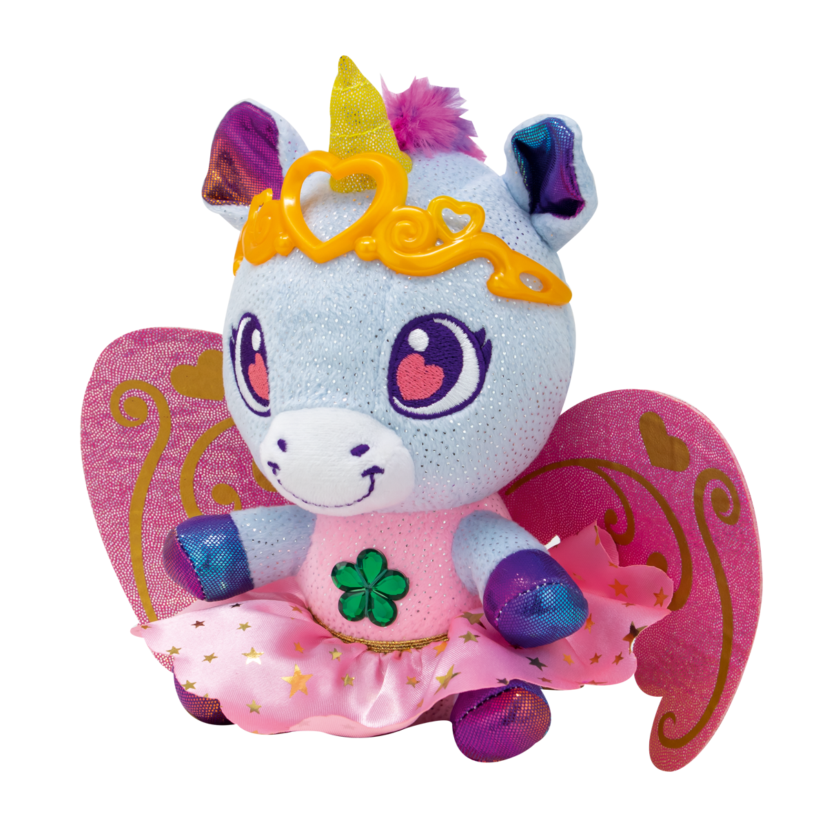 Meet the new Baby Gemmy Royal Wings series! Inside the royal pink egg, you will discover your cute unicorn! The removable/ interchangeable wings will open the door to a fantasy world with flying unicorns. These charming creatures keep magical gifts on their chest in form of gems (6 different ones), that they want to share with you: optimism, love, and good fortune; choose the one that matches you the best! Complete plush outfit with the golden crown and removable skirt. Let you imagination fly and start the adventure with your fantastic new friends! The egg can be transformed into a beautiful place with the cute decoration stickers!