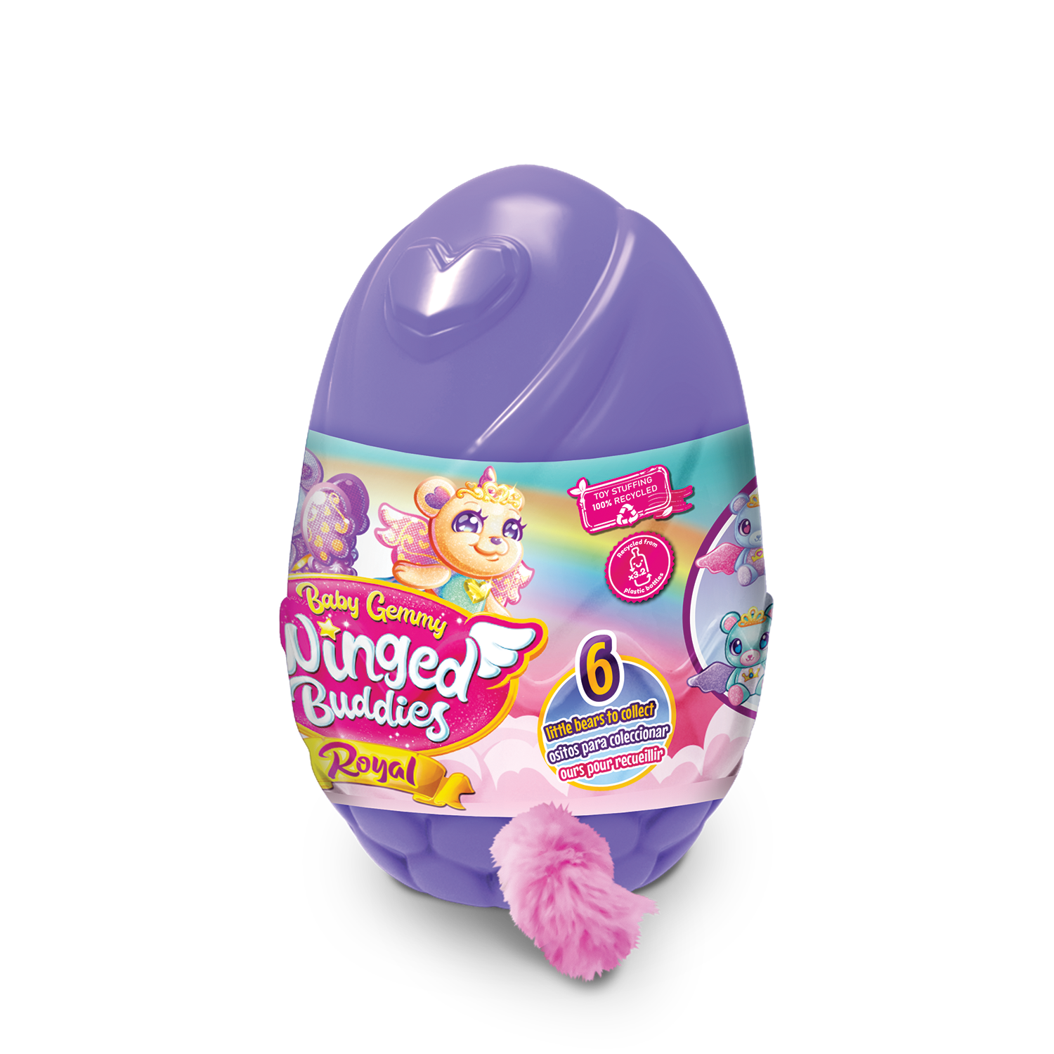 KEY FEATURES • Plush dimensions: 9 (W) x 9 (D) x 12 (H) cm • Egg Dimension: 11 (W) x 11 (D) x 16 (H) cm • 6 Bear characters to collect with royal theme on chest • 100% recycled stuffing. • Smooth and shiny skin. • Golden crown. • Wings stamped with sparkle pattern. CONTENT: • 1 Royal Bear
